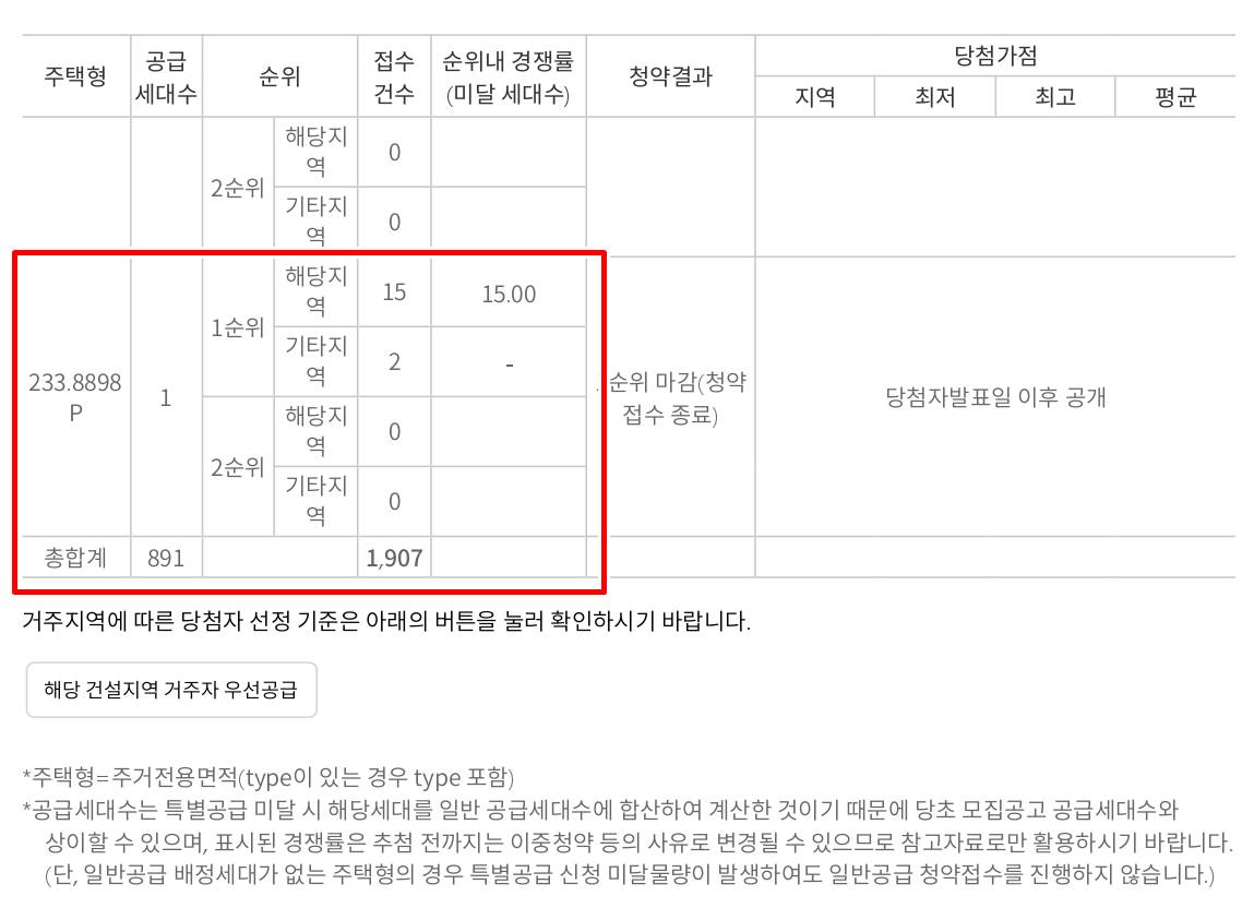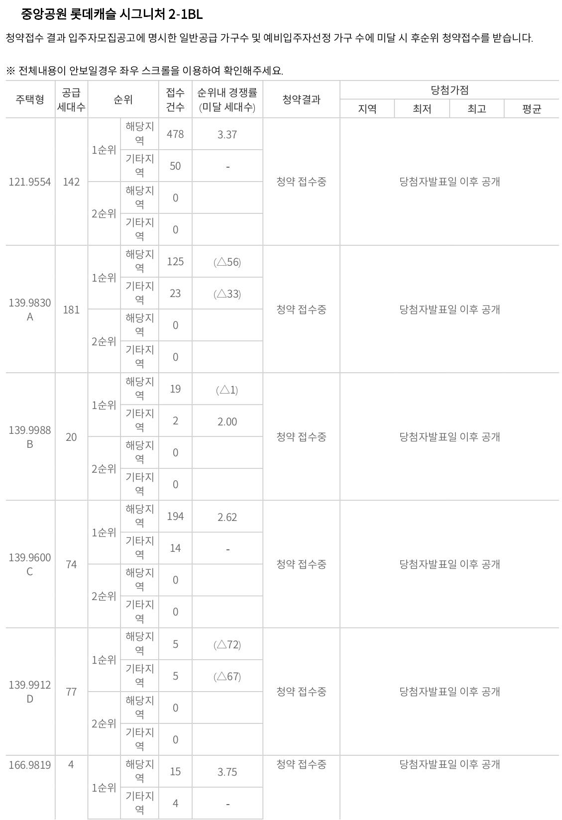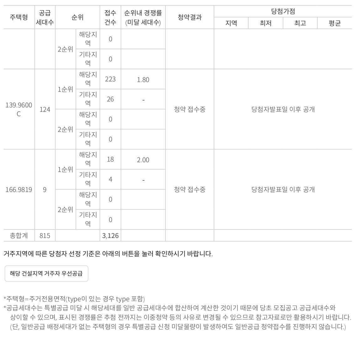 139A타입 총 181세대 모집에 125+23=148세대 청약접수를 하였고 139D타입은 77세대 모집에 10세대가 청약 신청 하면서 미달세대를 기록하였고 나머지 세대들은 모두 미달세대는 없었습니다.