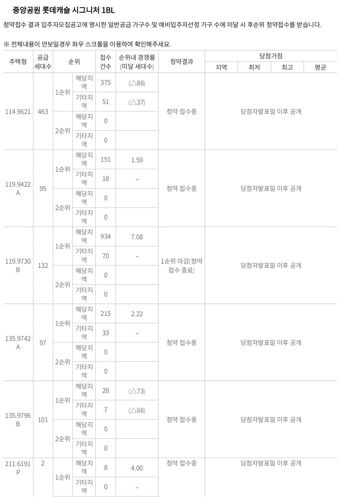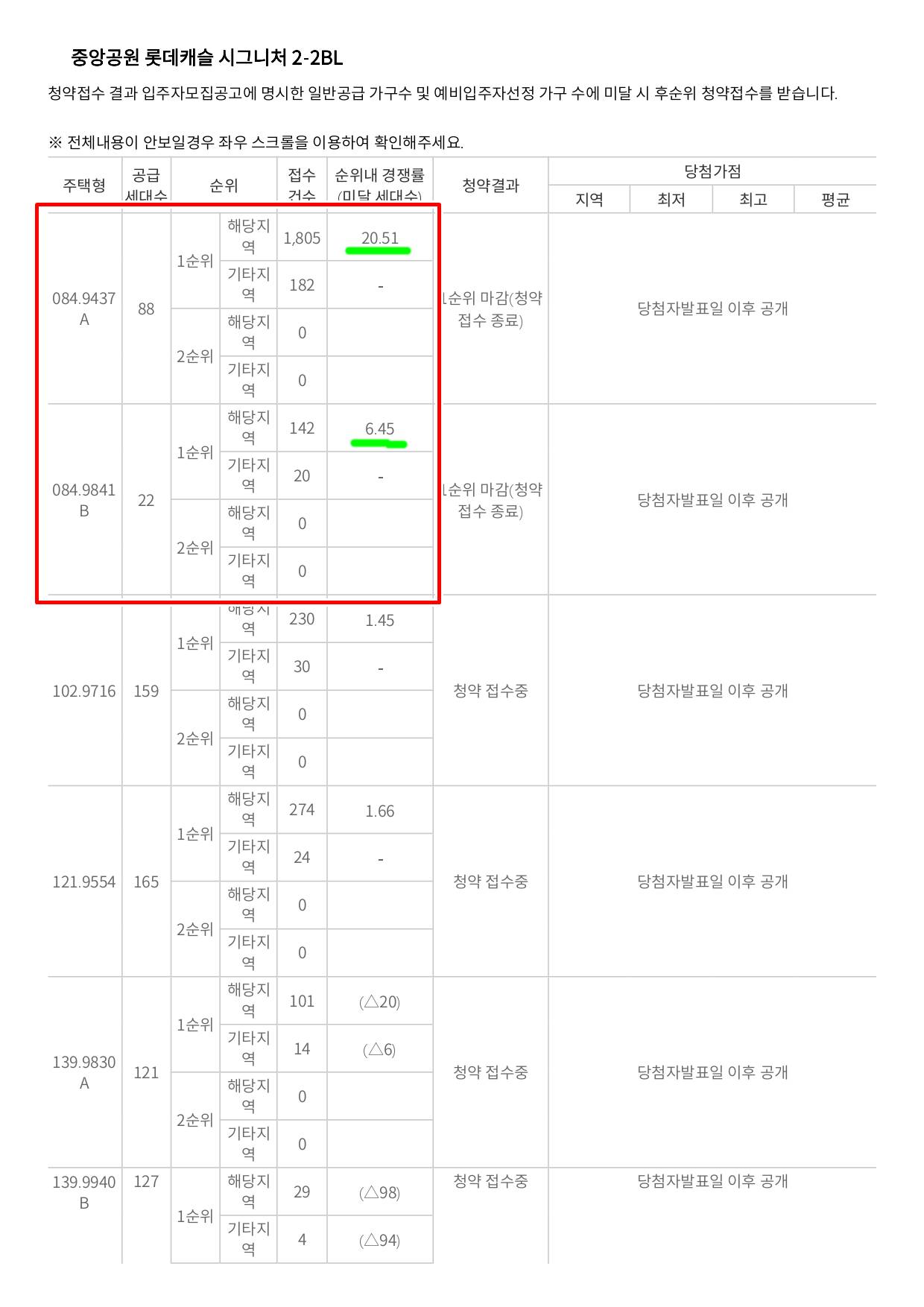 중앙공원 롯데캐슬 시그니처 2-2BL 1순위는 84A타입의 22.6 : 1이라는 최고경쟁률을 기록했다. 139A~B타입만이 미달세대를 기록했고 나머지 세대는 모두 미달세대가 없었다.