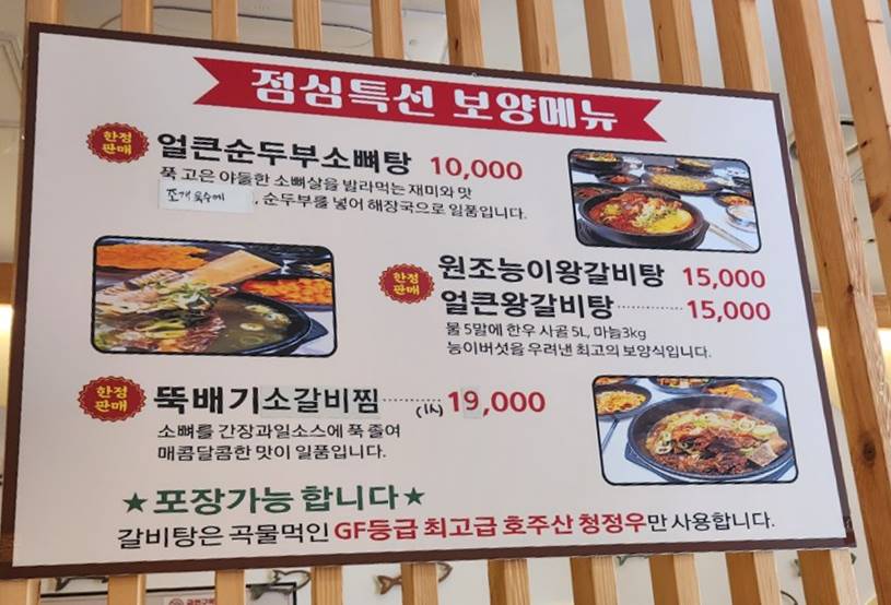 메뉴는 능이왕갈비탕이 주메뉴이고 얼큰왕갈비탕 전복 갈비탕, 뚝배기 갈비찜등이 있었고 설렁탕, 곰탕도 있었다. 점심특선으로 얼큰순두부소뼈탕과 뚝배기소갈비찜이 있었다. 능이왕갈비탕은 물 5말에 마늘 3kg 사골 5L를 끓여서 나오는 국물이라는 것을 강조하고 계신다.