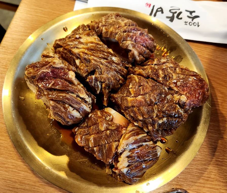 양념 소갈비와 , 소갈빗살 선택지가 없었다. 갈비는 남녀노소 어른 아이 다 좋아할 만 호불호 없는 메뉴라서 이 메뉴만 있어도 충분히 이 집에 갈 이유는 되는 거 같다. 상대적으로 소갈비가 저렴한 편이라 갈비가 별로 안 좋으면 어쩌나 했으나 갈비 중 최상급 부위를 사용하고 있어서 믿음이 갔다. 100년 소갈비집 옆으로 운암동 먹자골목에는 명륜진사갈비체인이 들어와 있었고 고기뷔페라 더욱더 손님이 많았는데 고기 맛으로는 여기가 더 좋은 것 같다.