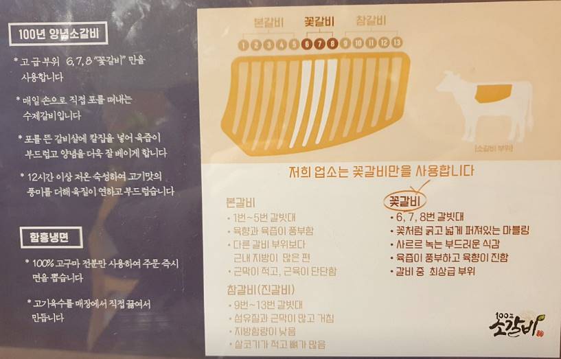 - 광주 소갈비 전문점이고 고급부위인 6,7,8번 꽃갈비를 12시간 이상 저온 숙성 시킨다고 한다.