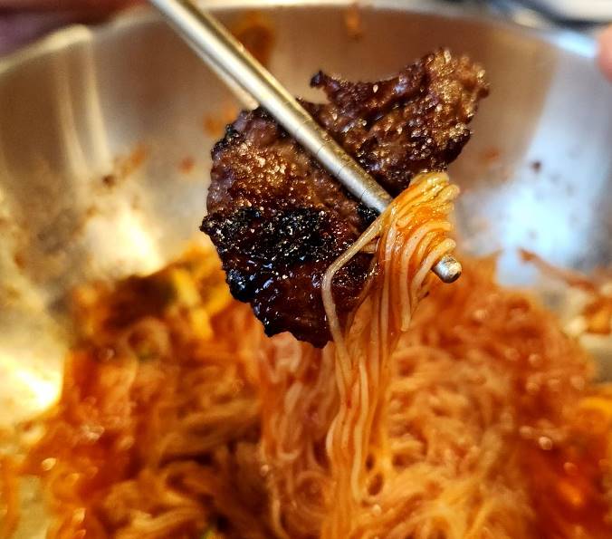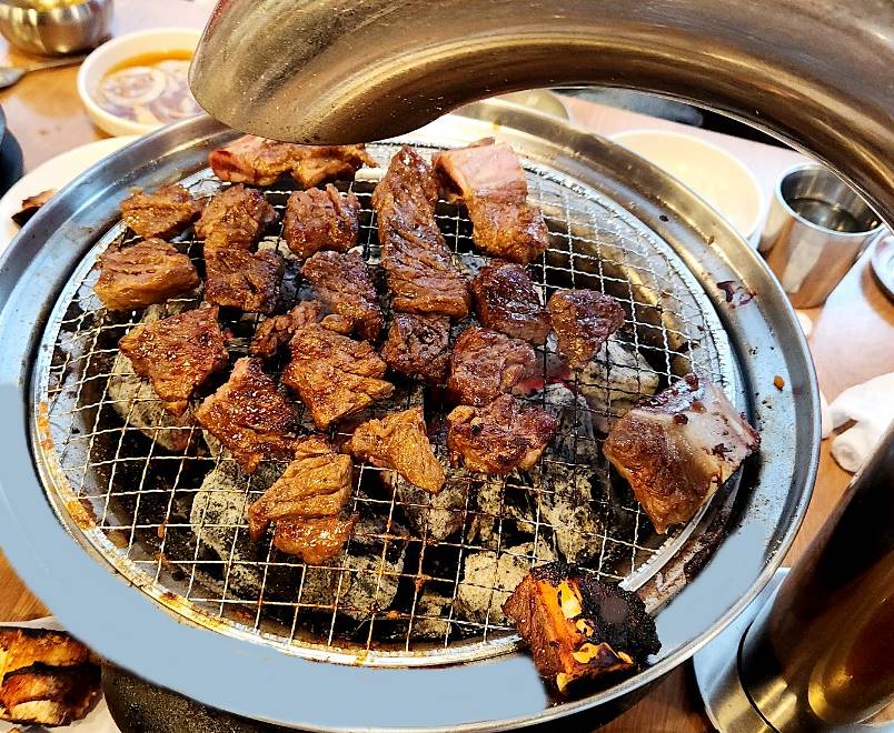 다 익은 갈비는 단짠단짠, 불맛이 더해져 환상의 맛의 조화를 선보여주었고 어른 3명 아이 2명이 6인분의 소갈비를 해치웠고 양이 생각보다 많지는 않았다. 6인분의 고기를 굽다 보니 어느새 화로는 기름과 탄 고기들로 더럽혀져 있었으나 맛은 진짜 인정~! 비빔냉면도 시켜보았으나 진짜 면이 엷고 쫄깃하고 양념맛도 일반 냉면전문점만큼 맛이 있었다. 고기가 타 보이나 절대 탄게 아니라는...^^