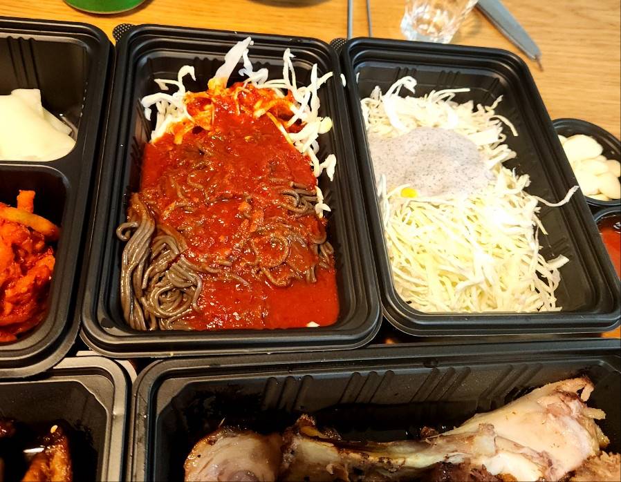 배달을 시키면 아래와 같이 메인 2 접시와 각종 반찬들과 채소가 옵니다. 두암점은 막국수소스를 뿌리지 않고 면이 퍼졌을 경우에 찬물에 면만 헹궈서 싱싱하게 먹을 수 있도록 배려도 해주셨다.