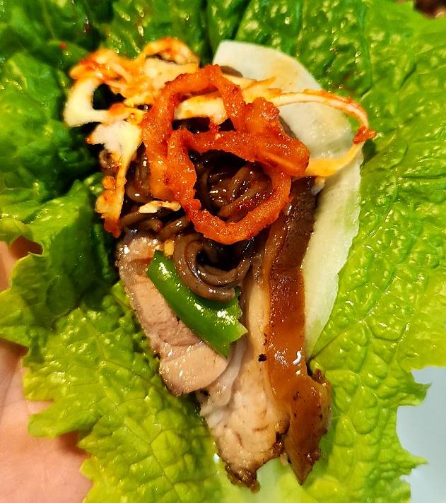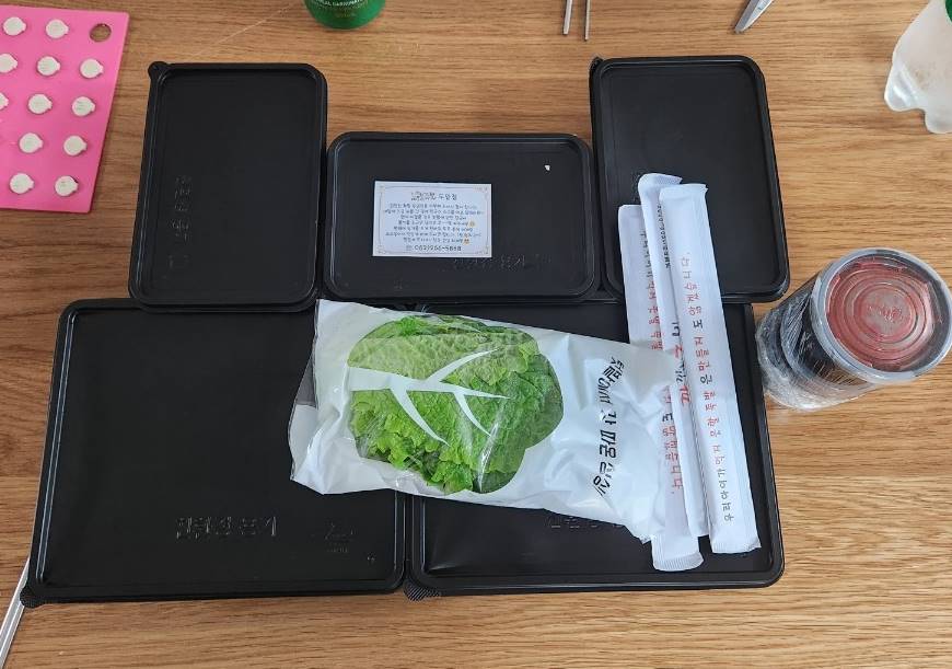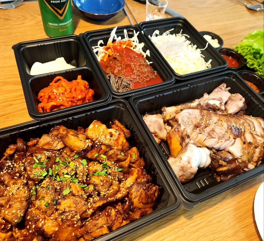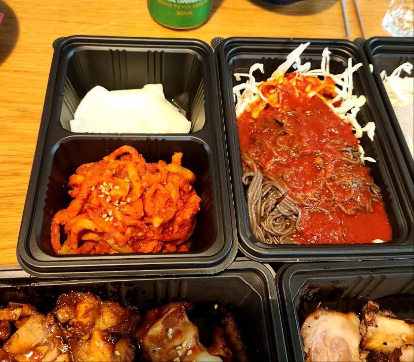 저희는 배달이 빨리와서인지 막국수가 퍼지지 않아 바로 소스를 부었고 쌈무, 무말랭이, 야채샐러드와 반반족발을 맞이했다. 뚜껑을 여는 순간 불향이 확~ 났었고 매운냄새도 확~ 났었다. 푸짐한 한상이 차려졌고 소주와 맥주는 덤으로~