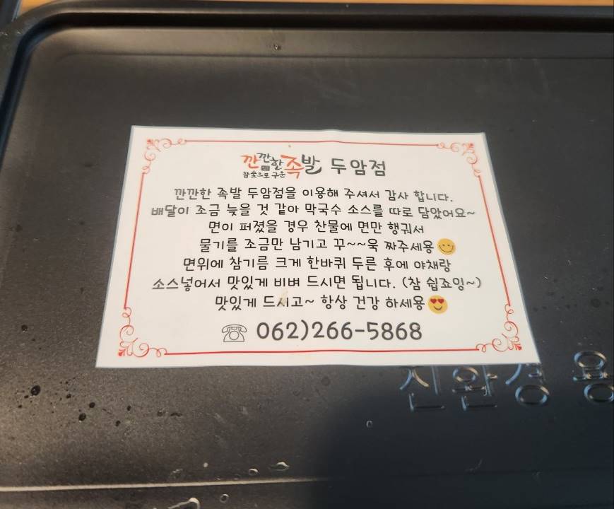 깐깐한 족발 두암점이 예전에 한번 족발을 너무 심하게 태워왔었는데 이거는 먹지 못할거 같아 전화를 하니 다시 하나를 다시 보내주었었다. 고객이 컴플레인을 했을 때 잘 대처하면 충성고객으로 갈 수있다는 마케팅적인 이론이 저에게도 통했었다.
