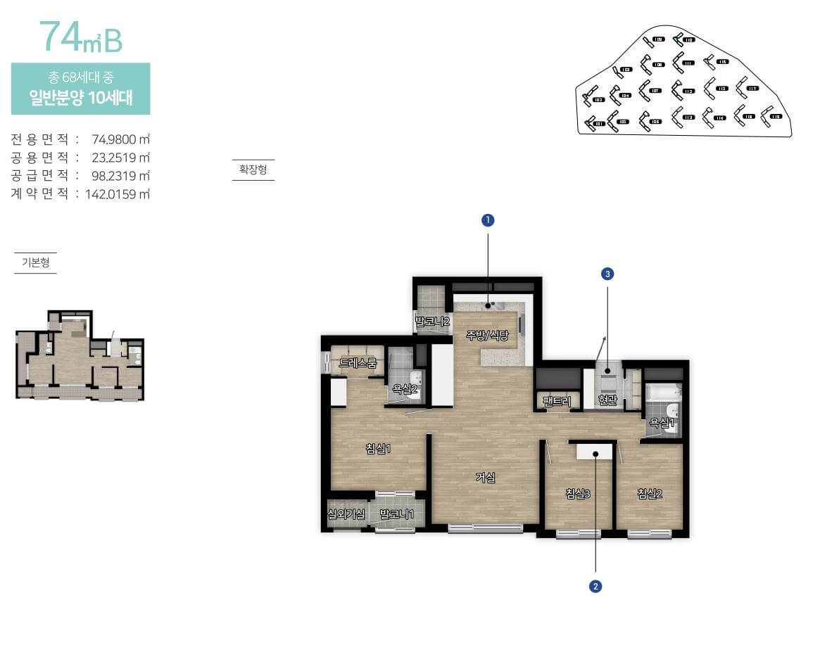 74 타입은 팬트리, 드레스룸등으로 수납공간이 두드러지며 판상형 구조를 띄고 있습니다. 유상옵션으로는 ①주방 벽체 엔지니어드스톤 ②침실 3에 반침장 ③현관에 3 연동 중문이 가능합니다.