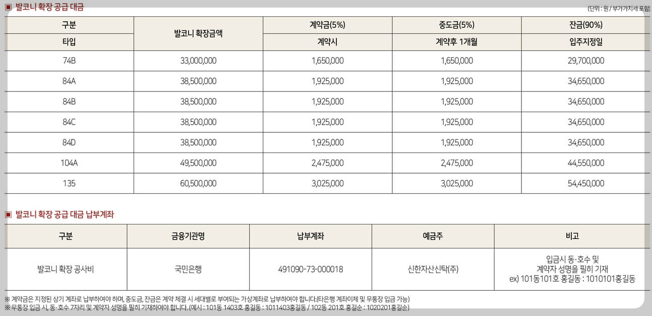입주할 때는 발코니 공사비, 유상옵션비, 분양대금 따로 납부를 해야 되기 때문에 해당 계좌대로 입금을 해야 된다.