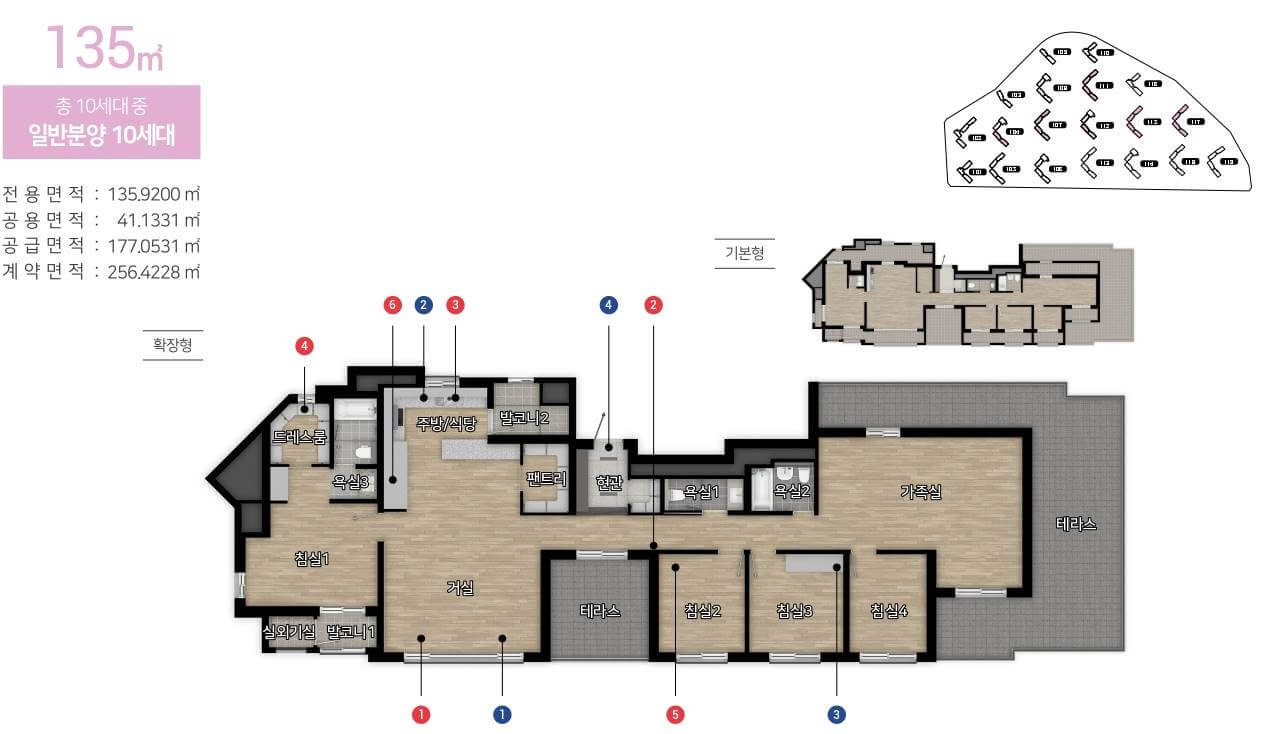 104 타입과 135 타입은 넓어서 그런지 곳곳에 수납공간이며 프라이빗한 공간이 많고 침실 4개와 가족실까지 있어 넉넉한 생활이 가능합니다.