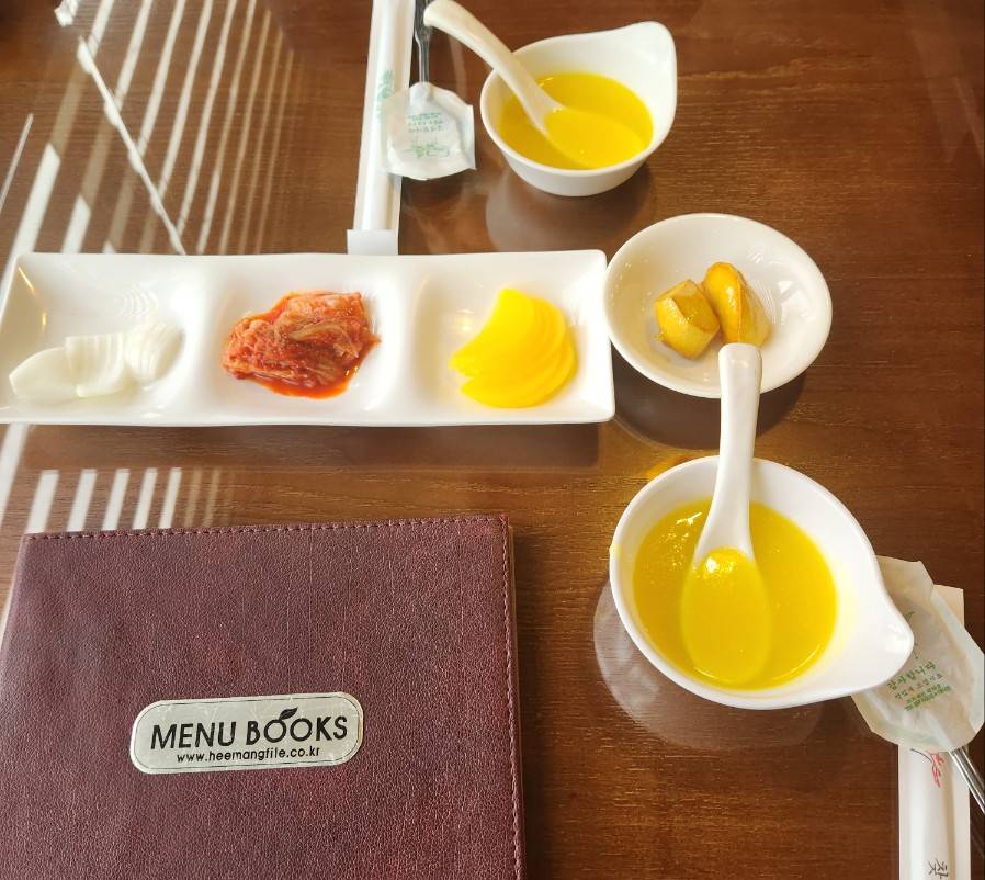 기본 반찬으로 내어주신 것은 기본 반찬에 고구마 맛탕, 옥수수 수프도 있었어요 옥수수수프는 생각보다 별로였지만 그래도 위를 보호시켜 주는 애피타이저로는 좋았습니다. 고구마맛탕은 양이 적었지만 고구마 탕후루느낌이 나면서 달달해서 맛있었습니다.