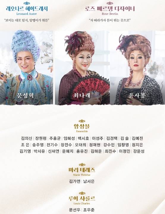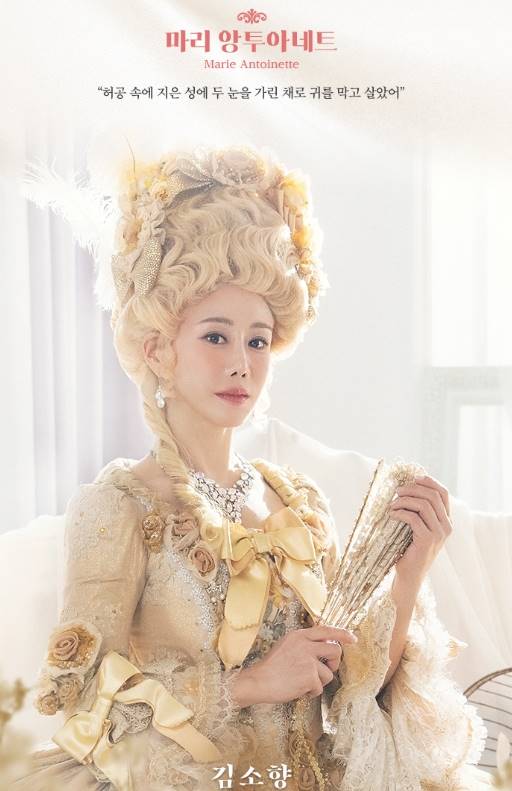 태어나면서 다이아몬드수저로 태어나 모든 것을 가졌지만 혁명으로 인해 비운의 왕비로 전락하고 마는 "마리 앙투아네트" 역에는 김소향 , 이지혜배우가 출연합니다.