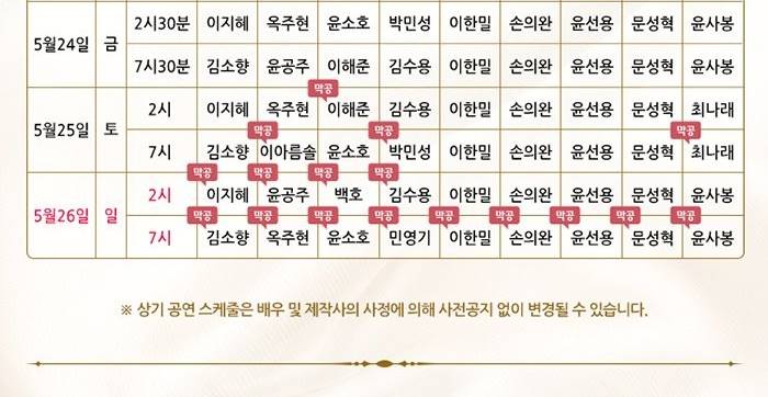 - 공연시간 : 오후 7:30분 (화,목,금), 오후 2:30, 오후 7:30분(수) , 오후 2시, 7시(토, 공휴일), 오후 3시(일)
