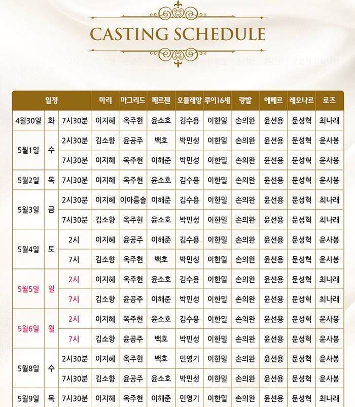 마리 앙투아네트는 마리, 마그리드, 페르젠, 오클레앙의 배우들의 일정들이 다르기 때문에 좋아하는 배우가 출연한 공연이 보고 싶으면 캐스팅 일정을 확인하고 예매하고 되겠습니다.