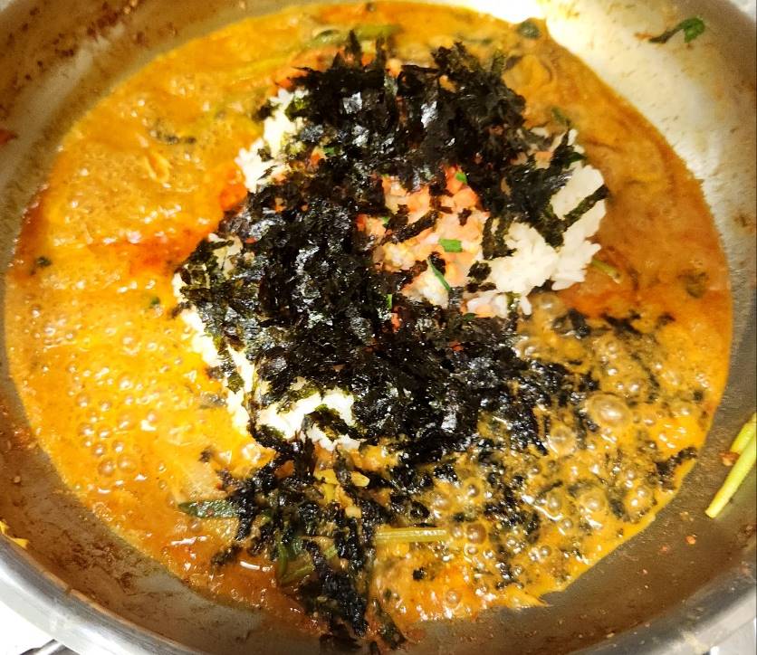 2인분 포장을 했으나 생각보다 양이 많았다. 야채, 채소의 양이 생각보다 많았다. 그러나 야채 채소들은 끓어지면 얼마되지 않는다. 메인 안에는 다대기같은 양념이 들어있어 끓으면서 저어주니 빨간색 국물이 보이기 시작했다.