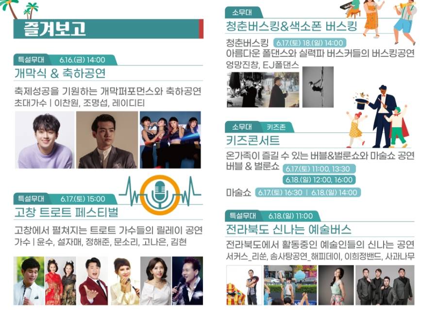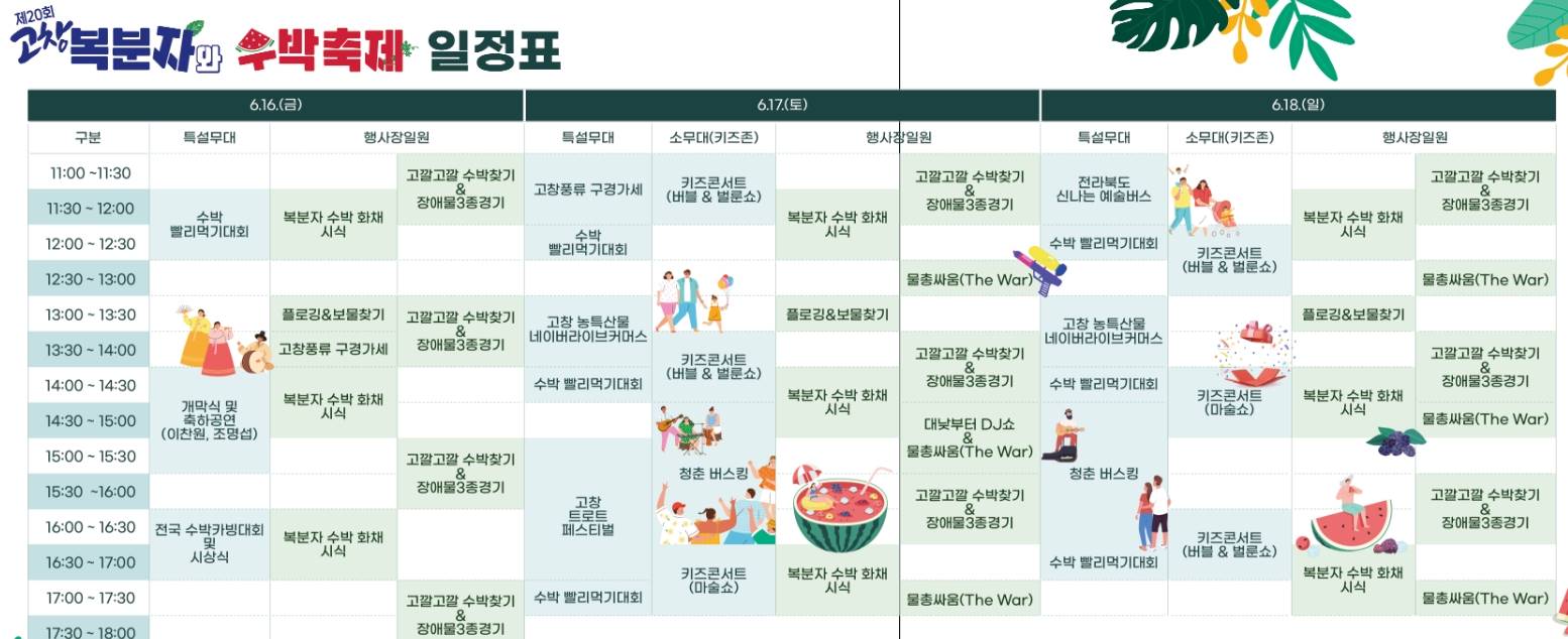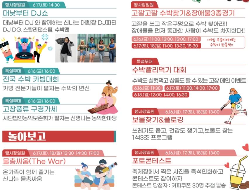 개막식에는 이찬원 가수가 함께할 예정이며 버블 마술쇼 공연 수박 카빙대회 물총싸움, 수박빨리먹기 대회 등 다양한 프로그램이 예정되어 있습니다.