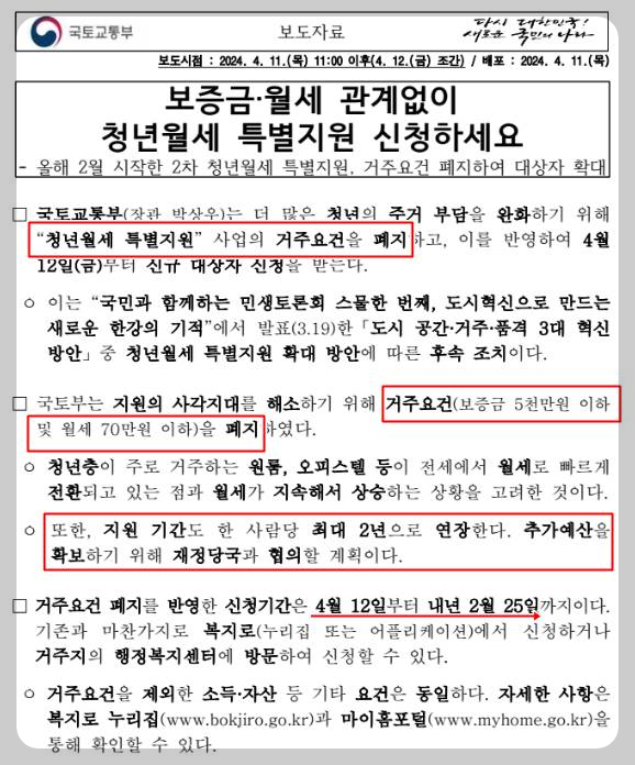 청년월세 특별지원은 청년들의 주거비 부담을 완화시키고자 국토교통부에서 진행을 하고 있습니다.