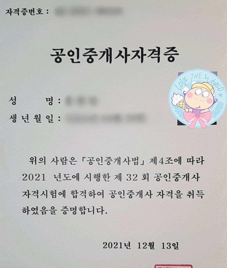 이 자격증을 따기 위해 얼마나 노력을 했는지 생각해 보길 바라며 그 노력을 왜, 무엇 때문에 했는지 스스로를 돌아보고 자신에게 맞는 분야가 어느 분야 인지도 경험을 해보고 공인중개사 자격증으로 성공하는 그날까지 파이팅 했으면 한다.
