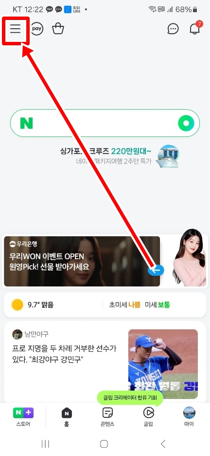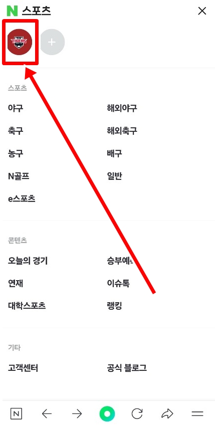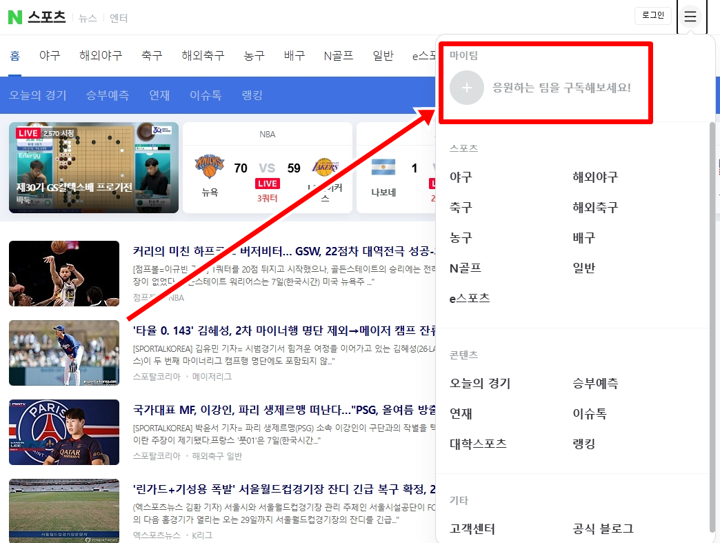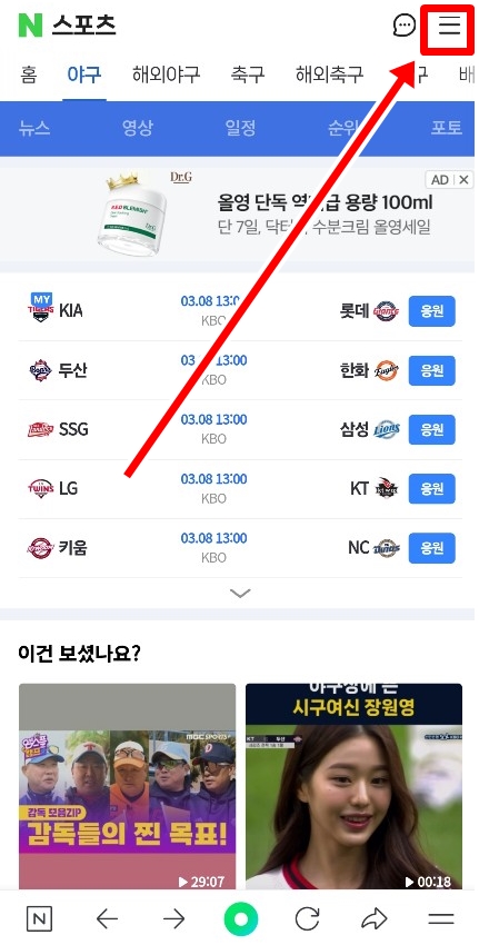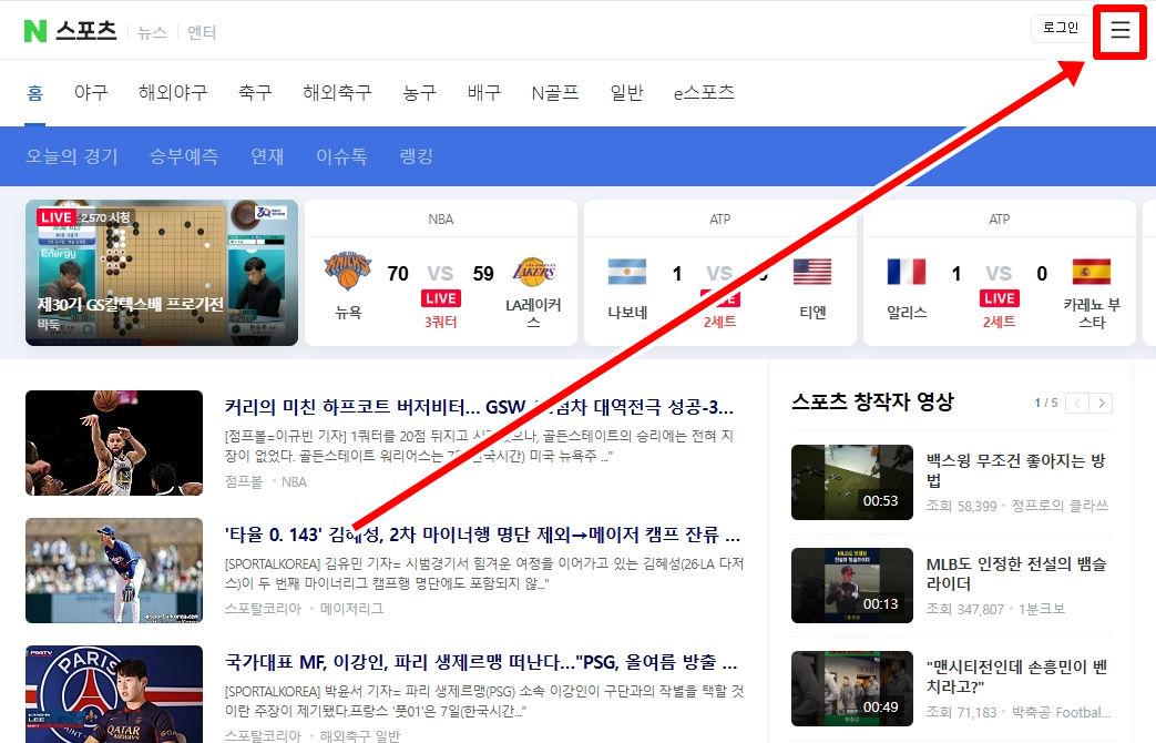 👉 2. 네이버 스포츠에서 오른쪽 상단에 삼줄 리스트 아이콘을 클릭한다.
