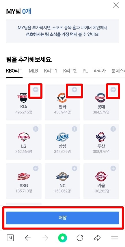 👉 5. 응원하는 종목 및 구단을 " + " 버튼을 눌러 추가해 주고 저장을 눌러줍니다.