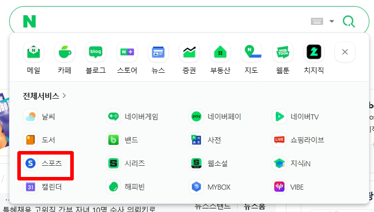👉 1. 네이버 메인화면에서 세 개의 점 아이콘을 누르면 아래와 같이 스포츠를 클릭하고 들어간다.