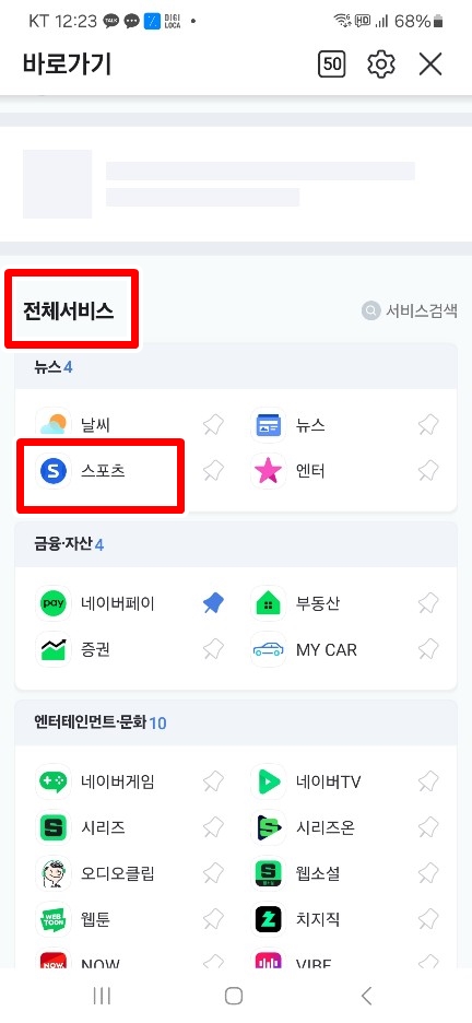 👉 2. 오른쪽 상단에 삼줄 리스트를 클릭 후, 전체 서비스에서 "스포츠" 선택!