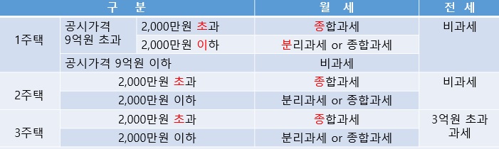 공시 가격이 9억 원을 초과하는 주택소유자는 월세 수입에 대해서 임대소득세를 납부해야 하고 종합과세는 수입금액으로 2,000만 원 초과하면 대상이 되고, 2,000만 원보다 적으면 종합과세와 분리과세 중 선택하면 된다. 공시 가격 9억 원 이하일 때는 비과세가 적용된다. 분리과세는 다른 소득과 합산하지 않고 별도로 계산해서 세금을 계산하는 방식으로 이자소득, 배당소득, 주택임대소득 등이 있다. 위의 표를 참고하면 주택수에 따라 월세와 전세의 과세유형을 정할 수 있을 것이고 주택수에 따라 임대소득세가 확연히 달라지게 되는 경우가 발생할 것이다. 공인중개사 세법 시험에 간간히 한 문제씩 출제되는 부분이고 필자가 자주 틀렸었던 부분이기도 하다. 그래서 말도 안 되지만 첫 글자만 따서 암기 코드를 만들어 버렸다. "초이종분 초초종" 실제 시험이 얼마 남지 않은 상황에서 별로 중요하지 않게 여기다가 한 문제 한문제가 소중하기에 암기 코드를 만들었기 떄문에 기억에 남는 암기 코드다. 월세 부분을 보면 두 가지로 구분이 되어있는 것을 볼 수 있어서 "초종" 이라고만 외우면 편하긴 하지만 필자는 문제를 빨리 풀기 위해 이러한 암기 코드로 외웠고 2,000만 원 초과, 이하 순서로 종합과세, 분리과세 순으로 외웠다. 지금은 잘 생각이 나지 않지만 "초과되면 종합과세" 이 부분의 오류가 있어서 "초이종분" 이렇게 외웠던 거 같은데 워낙 실제 시험 몇일 남기지 않고 급하게 외웠던 부분이라서 정확하게 기억이 나질 않는다. 포스팅을 하면서 기억이 나게 되면 나중에라도 왜 이러한 암기 코드를 썼을 수밖에 없었는지에 대해 언급하겠다.
