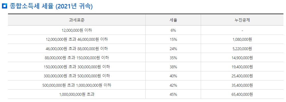 종합소득세란 말 그대로 1년 동안의 모든 소득을 종합적으로 합쳐서 내는 세금을 말한다. 여기서 모든 소득에는 근로소득, 사업소득, 연금소득, 이자, 배당소득, 기타 소득을 말한다. 종합소득세는 소득이 많은 사람이 더 많이 납부해야 되는 누진세율을 적용하고 6%~45% 사이에 세율을 적용한다. 양도소득은 양도소득으로 별로 납부를 하여야 하고 퇴직소득도 종합소득세에 포함되지 않고 분류과세에 속하므로 종합소득에는 포함되지 않는다. 장기근속 근로자가 한 번에 퇴직금을 받으면 소득이 많이 올라가게 되므로 퇴직금을 받는 순간 세금 폭탄을 맞을 수 있기 때문에 이 부분은 분류과세를 해주는 게 맞을 것이다. 주택임대소득은 2,000만 원 이하일 경우 분리과세로 14%의 세율을 적용하고 2,000만 원을 초과하면 임대소득 전체가 종합소득에 합산이 되는 구조이다. 또한 상가 임대소득은 금액 상관없이 금액 전체가 종합소득에 포함하게 된다.