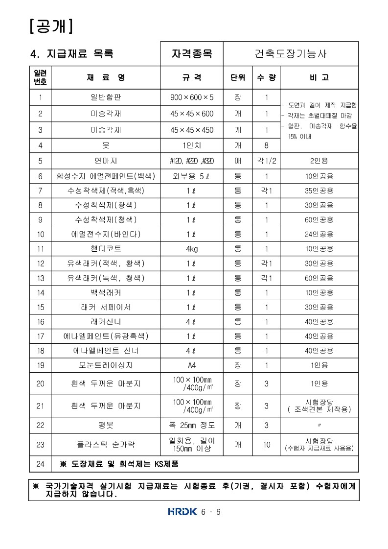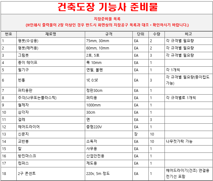 붓이며 샤프며 테이프며 할 거 없이 본인이 준비해서 가야 된다. 위에 사진은 본인이 준비해야 되는 목록이고 아래 사진은 실제 시험장에서 지급되는 품목이다. 대부분의 수험자들은 학원에서 교육을 받고 시험을 보러 간다고 생각하기 때문에 실습하면서 어느 정도 준비물은 갖추어 두었을 것이고 만약 준비가 안되었다면 인터넷에 "건축도장기능사 준비물"이라고만 쳐도 쉽게 구입이 가능하다.