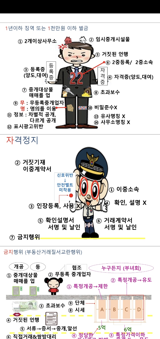 도대체 이 말도 안 되는 그림은 무엇인가 말인가. 그러나 이 그림 덕분에 실제 32회 시험에서 중개사법령 및 실무 과목에서 87.5점이라는 점수를 득점할 수 있었다. 처음에는 이게 무슨 그림이지 싶다가도 계속 반복에 반복을 거듭하면 무의식 중에 생각난다. 그리고 시각으로 익히고 말도 안 되는 스토리에 빠지다 보면 '이게 그래도 말이 되는구나'라는 것을 교수님께서 세뇌시켜주시기 때문에 이 그림은 정말 효자 그림이다. 그리고 이런 스토리와 그림으로 암기를 할 수 있게 한 부분에 대해서 임선정 교수님은 정말 이 과목에 있어서 최고의 교수님이라고 생각한다. 필자는 실강을 들었기 때문에 에듀윌에 장성태 교수님 수업을 들었으나 암기 코드 같은 부분이 맞지 않아 암기 부분은 임선정 교수님 암기 코드를 이용을 했고 장성태 교수님은 이론 부분에 탁월하셔서 두 분의 교수님 꺼를 모두 수강했었다.