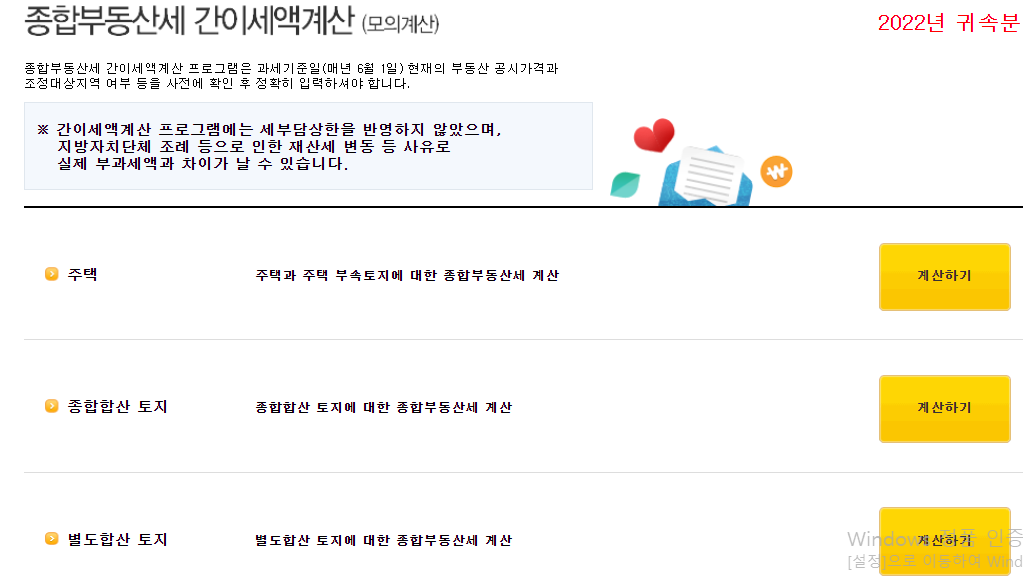 홈택스 사이트에서는 종합부동산세 모의 계산을 해볼 수 있게 서비스를 제공하고 있다.