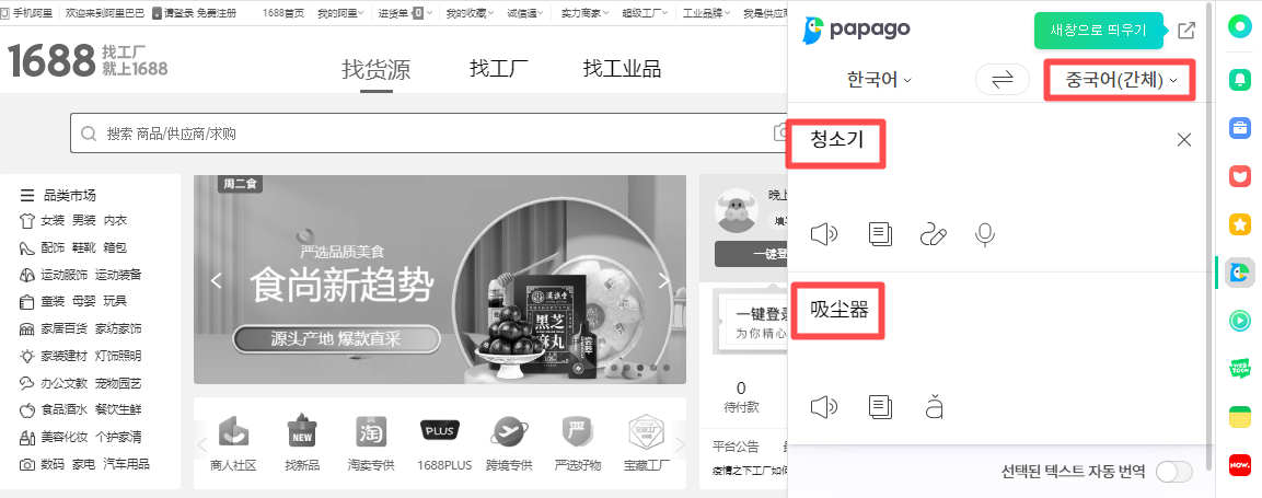 1. 네이버 웨일을 쓰면 옆에 사이드바에서 파파고로 번역된 글자를 복사해서 붙여 넣기 한다. (중국어 간체) "吸尘器""청소기를 이렇게 번역했을 때 나오는 결과를 보면 거의 핸디형 청소기 위주로 검색이 되는 걸 볼 수 있다.