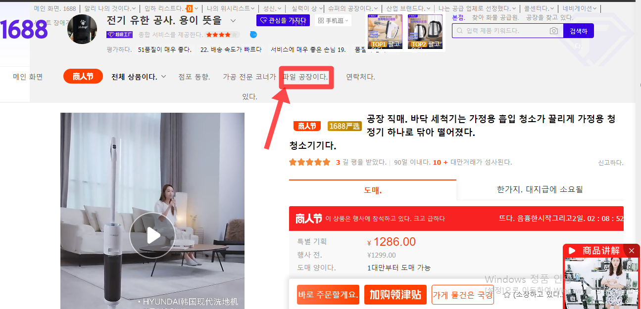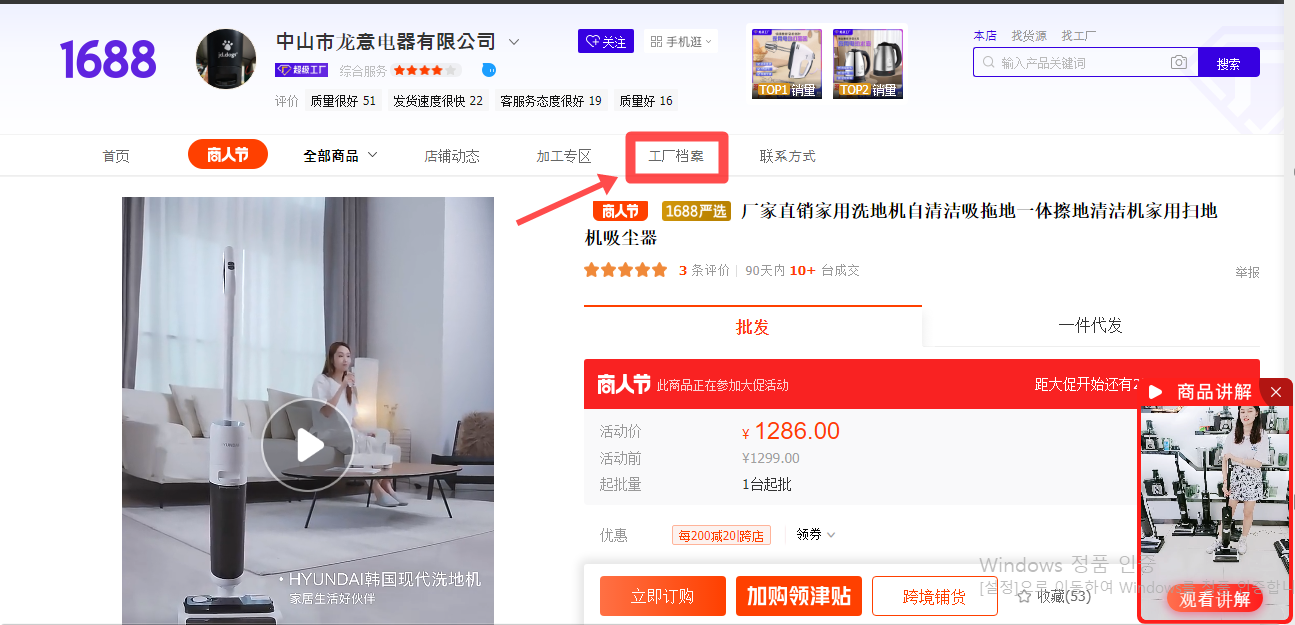 3. 그다음은 판매자 페이지에 들어가서 이 판매자가 어떤 물건 등을 판매하고 있는지를 본다. 제조공장이라면 그 공장에서만 나올 수 있는 제품을 팔아야 되는데.. 그렇지 않고 기계 공장인데 건강식품, 화장품 등을 판매하고 있으면 이 또한 진짜 공장이 아니라 유통업체이다. 이걸 확인하는 방법이 1688은 참 잘 되어있다. 밑에 사진처럼 "工厂档案"를 번역하면 "파일공장이다"라는 곳을 클릭한다.