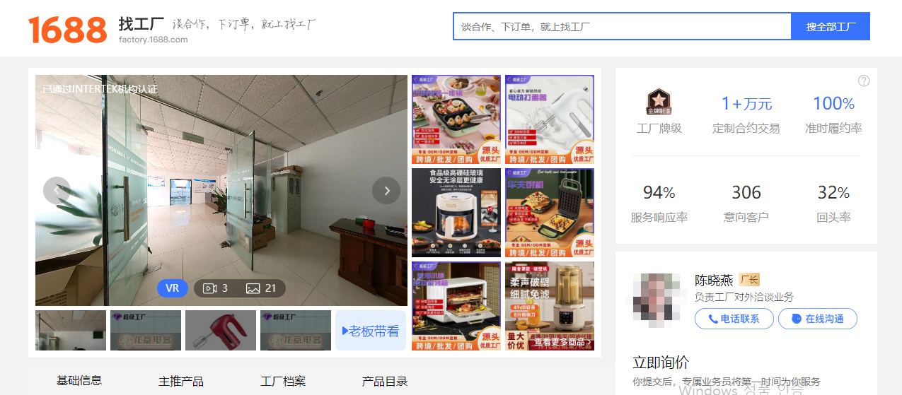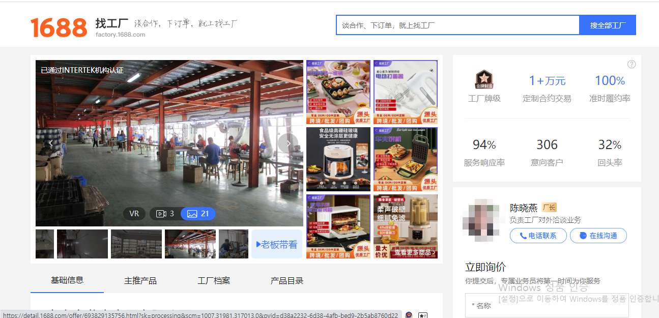 이렇게 클릭을 했으면 밑에 사진처럼 공장 내부사진이며 직원이며 취급하고 있는 제품은 어떤 것이 있으며 연간 거래액, 가공 설비수 등 여러 가지 정보를 수집할 수 있으며 필요시에는 오른쪽 사진에 "제비. 천 샤오" 대외 담당자에게 직접 연락을하여 샘플이라든지 더 세세한 정보를 물어볼 수도 있고 대량 구매 시 견적에 대해서도 답변을 해준다. 이때 회사 내부 환경을 자세히 살펴볼 필요가 있다. 자동화 시스템으로 되어있는지 정리정돈이며 직원들 상태는 어떠한지에 대해서 심혈을 기울여 봐야 한다. 이렇게 꼼꼼히 확인해야 나중에 실제 내 제품을 의뢰하고 공급받았을 때 불량률이 현저히 줄어든다.