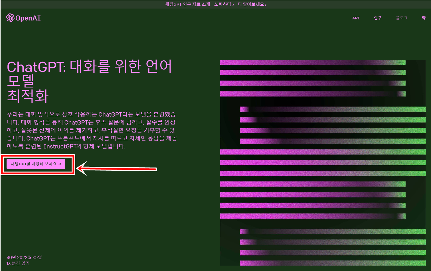 각종 포털사이트에 chtgpt를 검색하시면 쉽게 홈페이지 사이트로 접속이 됩니다. 여기서 저는 한글로 설정을 해놓았기 때문에 한글로 번역된 사이트가 보이게 되고 대부분은 영문으로 된 사이트가 있을 것이다.