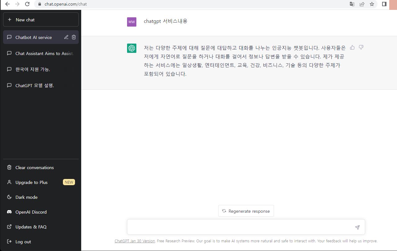 chatgpt의 서비스내용 부분에 대한 답변입니다. 교육,건강,비즈니스, 기술 등등 여러 가지 서비스를 제공한다고 하고 거의 모든 부분에서 서비스를 진행하는 것 같아요.