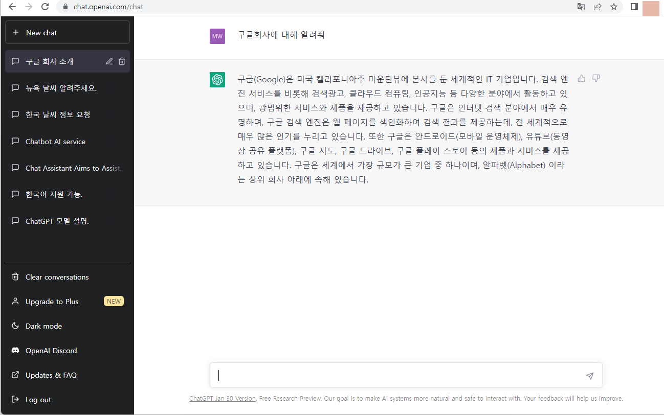 구글 회사에 대해 검색을 해보니 간단하지만 정확한 정보를 제공해 주고 있어 이런 게 chatgpt의 장점이 아닐까 싶어요.