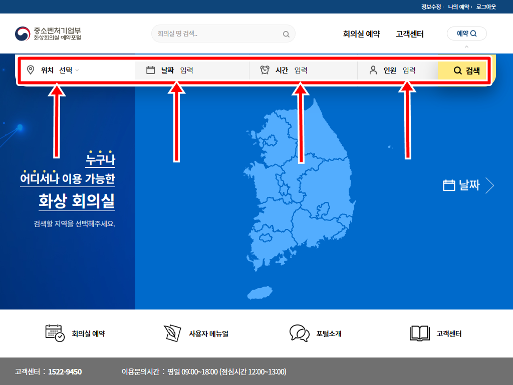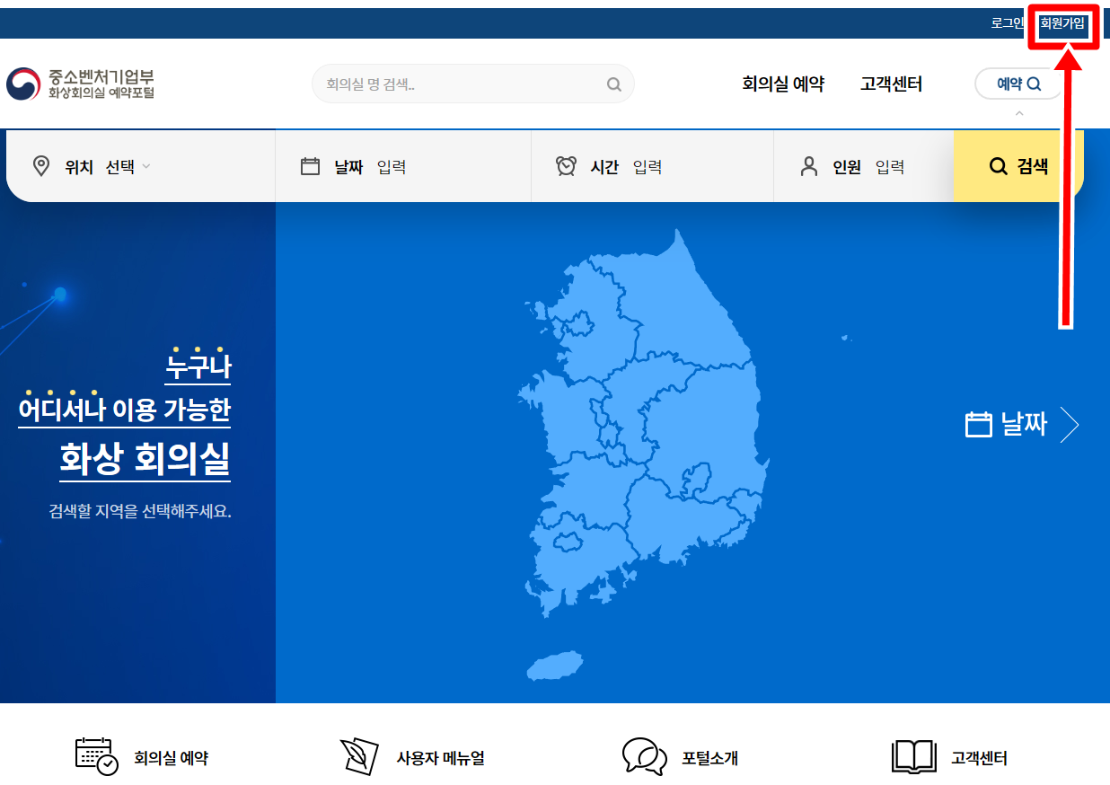 회원가입이 되셨으면 메인페이에 다시 오셔서 위치,날짜,시간,인원을 입력하시고 검색버튼을 눌러 가능한 회의실이 있는지 검색하면 됩니다.