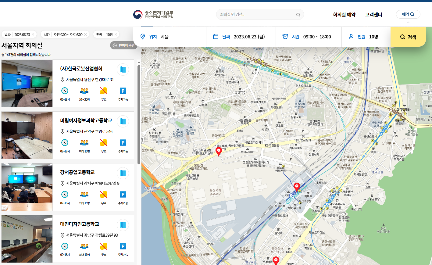 여기에서 자신이 대여하고자하는 위치와 날짜, 시간, 인원을 입력하면 가능한 회의실 목록이 나온다.
