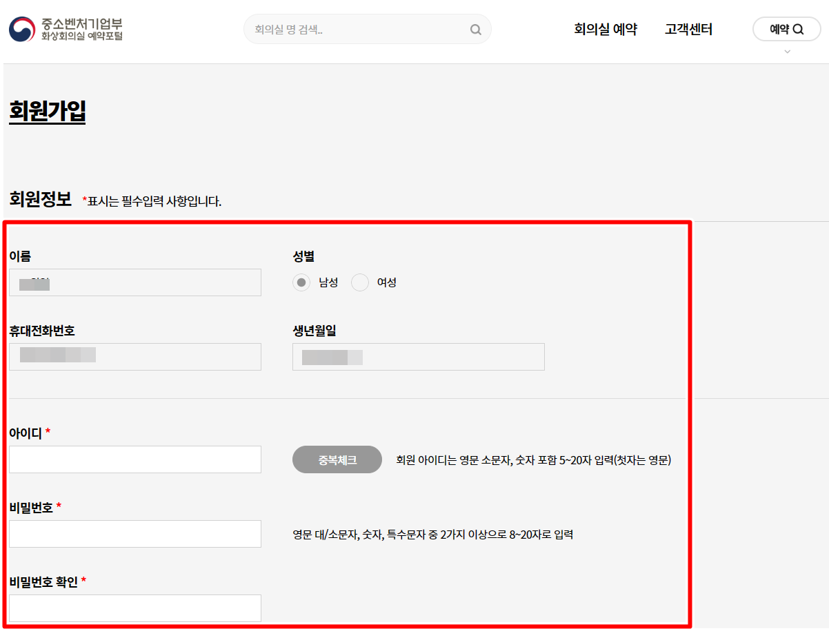 중소벤처기업부 화상회의실 예약포털에 들어가면 아래와 같은 화면이 나올 것이다.