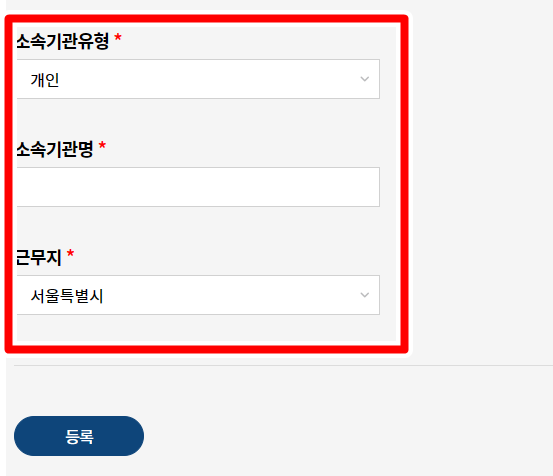 소속기관유형은 개인이면 개인으로 하면 되고 사업체면 그에 맞게 작성하면 된다.