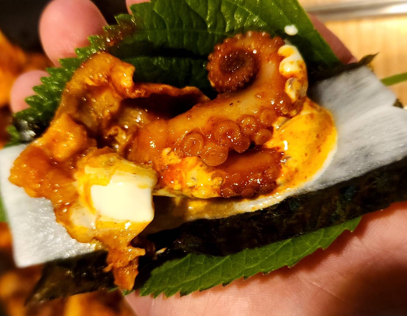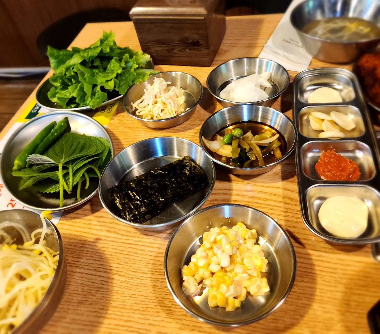 깻잎 위에-> 김->무쌈-> 마요네즈->고추->쭈꾸미->삼겹살 순으로 쌈을 싸서 먹으면 맛있다고 하여 그대로 진행~!