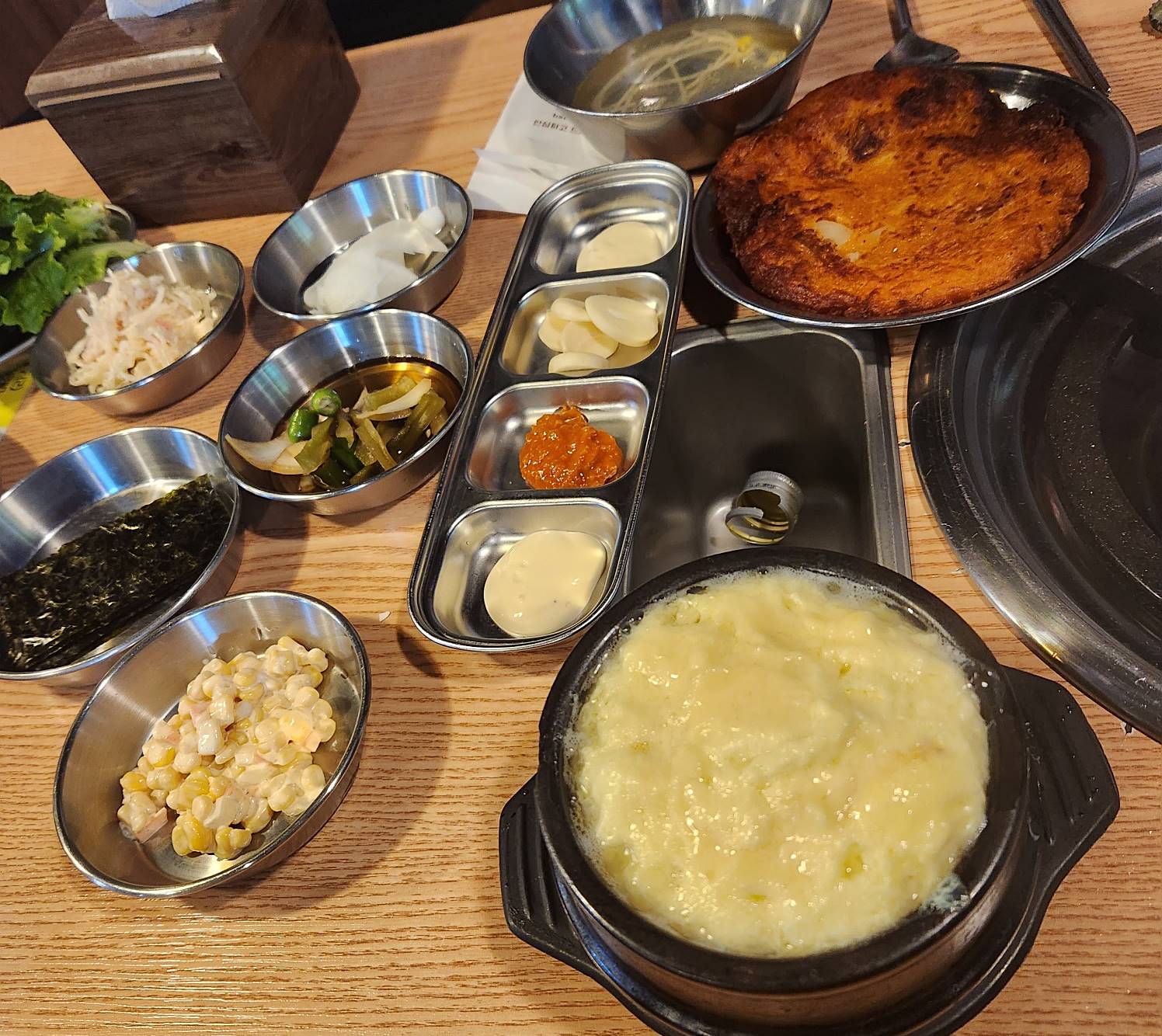 기본찬은 쭈꾸미를 싸 먹을 수 있는 야채, 김, 무 소스 등이 있었고 푸짐한 계란찜, 김치전까지 나왔다.