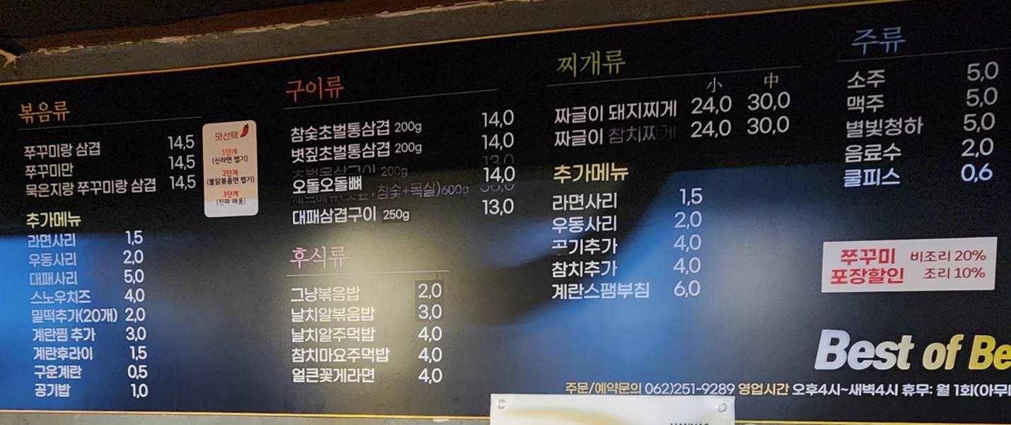 메뉴는 쭈꾸미 삼겹 묵은지 조합까지 다양하게 선택할 수 있고 특이한 점은 맵기 조절이 가능하다는 점이다.