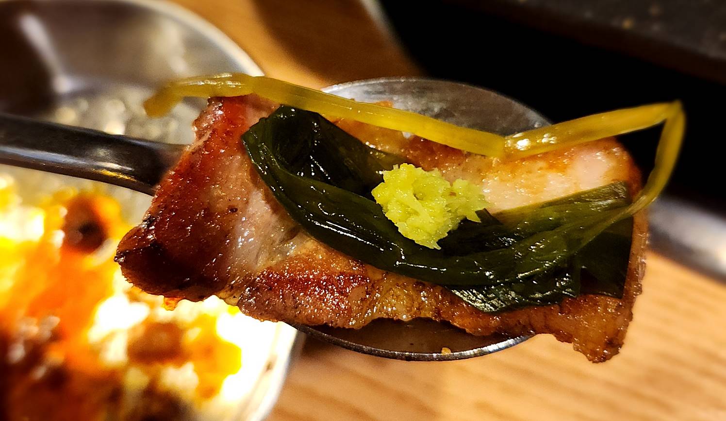 볏짚삼겹살 위에 명이나물에 와사비조화~! 그리고 마지막은 한잔~!
