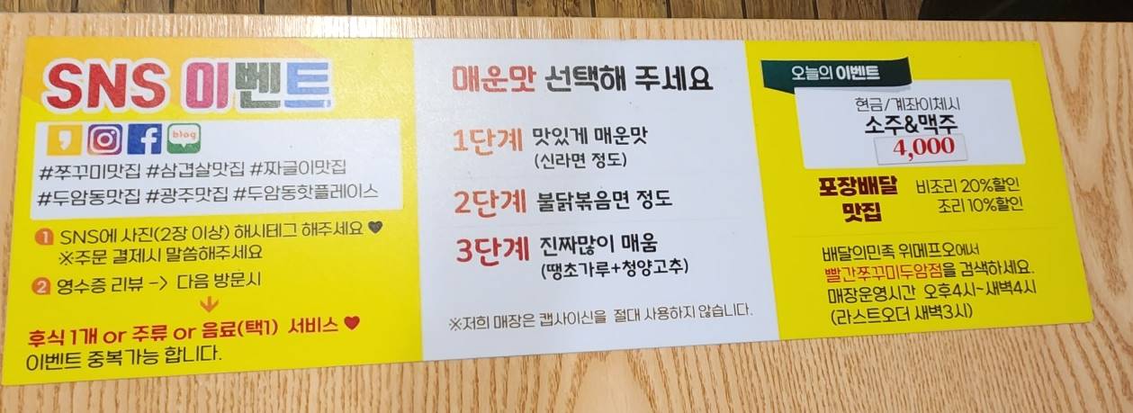 1단계는 신라면 정도이고 2단계는 불닭볶음면 정도 3단계는 정말 매운 단계였고 지금은 이벤트 중이어서 쭈꾸미와 주류까지 할인 판매를 하고 계셨다. 여기 사장님 방송까지 출연하신 유명하신 분이시구나~!