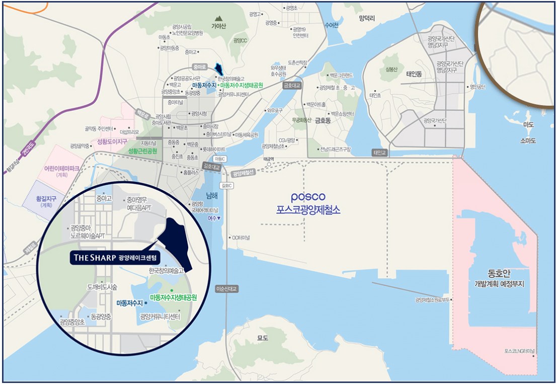 포스코 광양제철소와도 멀지 않고 광양시청과도 인접성이 뛰어나다. 주요 관공서와도 가까워 광양의 중심권의 생활을 누릴 수 있다.