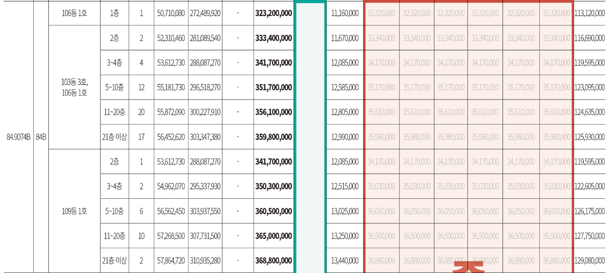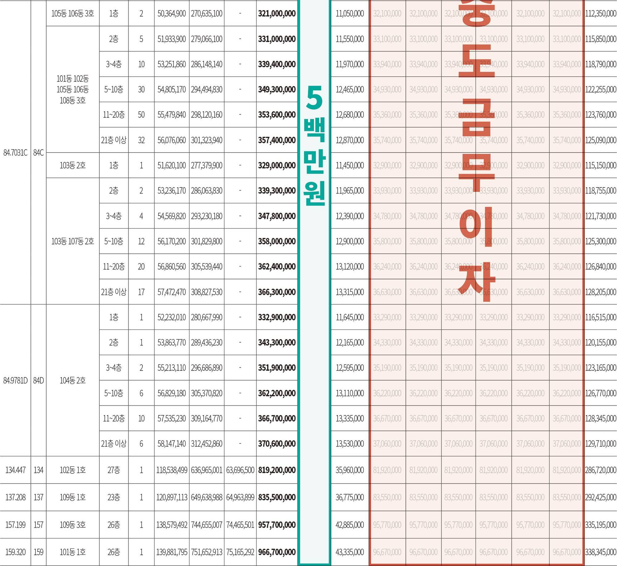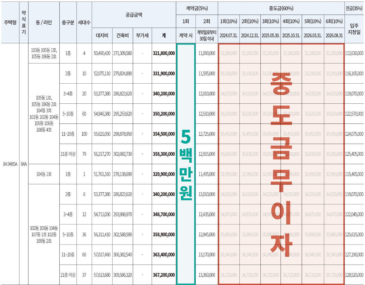 이렇게 미분양이 나와버려서 지금은 잔여세대 선착순 동, 호 지정을 하고 있고 계약금 5%(500만 원)만 있으면 중도금은 전액 무이자로 가능하다.