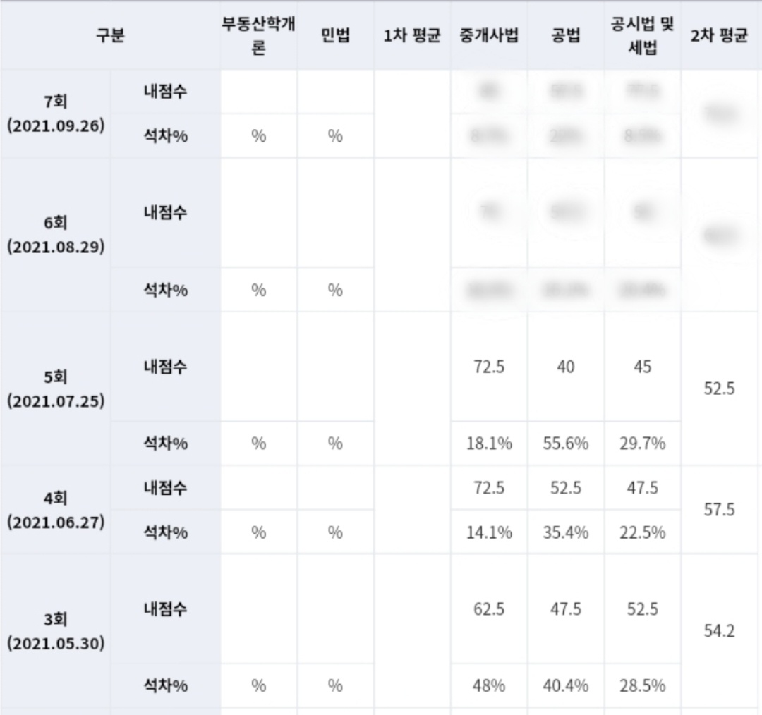7월부터 시험의 난이도가 대폭 상향되는 것을 느꼈고 점수도 형편없었었다. 이번 모의고사는 어려웠을까 아니면 내가 공부를 안 했었나 나는 공부를 그 전보다는 더 열심히 한 것 같은데 아니었나 보다. 중개사법은 저번 모의고사와 똑같은 점수였고 부동산공법 같은 경우에는 공부할 양이 많아서인지 내가 몰라서인지 모를 정도로 아는 문제를 찾기 어려웠다. 정말 턱걸이 점수인 40점. 40점은 아니지 않나라는 생각과는 반대로 찍었던 문제가 득점을 하였기 때문에 실제로 알고 풀었던 문제는 40점 아래라는 이야기가 된다. 공시법 및 세법도 마찬가지였다. 이때는 정말 화도 났었고 절망도 했었고 이러다가는 정말 합격을 못할 것 같다는 불안감도 밀려왔었다. 아직도 그때 생각하면 아찔하다. 그러나 필자는 물러날 수도 없었고 어떻게든 싸워 이겨내야만 했다.