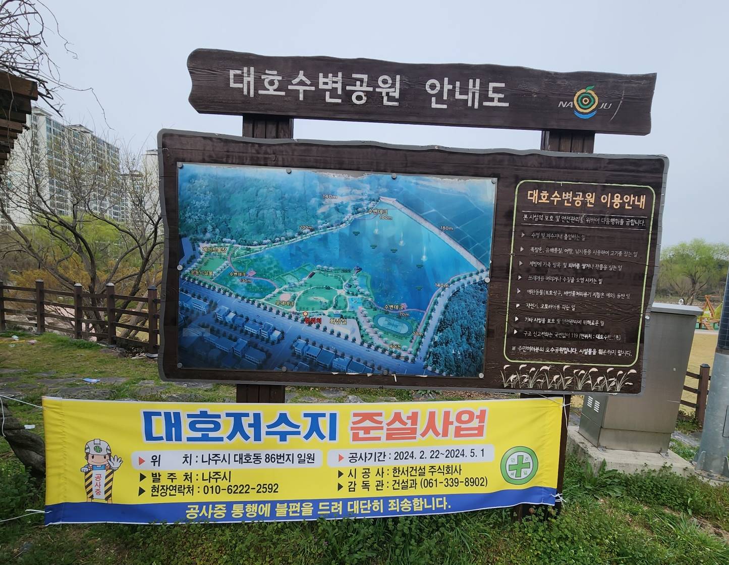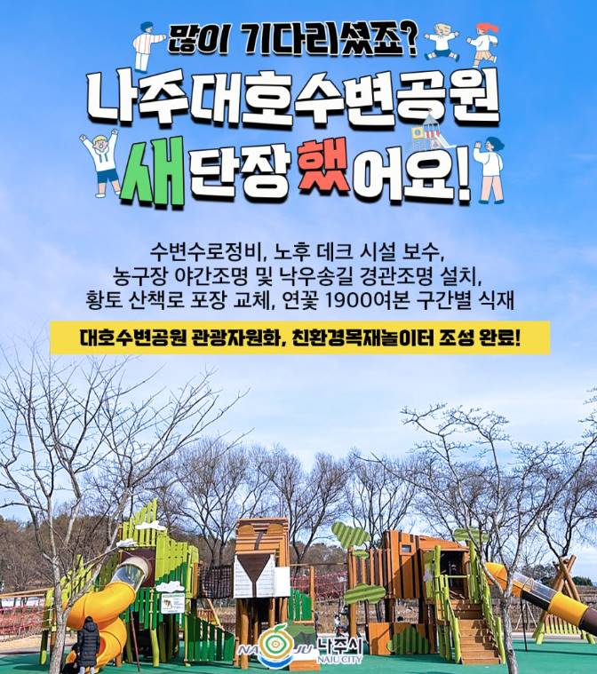 그동안 이공원은 시설노후화와 안전성 문제가 대두되어 온 바 공원을 정비해 주라는 주민들의 민원들이 많았다고 해요. 호수공원은 여러모로 쓰임새가 많은 곳인데 관리가 잘 되어있지 않아 말썽이었나 봅니다. 그래서 이번에 수변 데크 산책로라던지 바닥분수, 체육시설등 여러 부분을 정비하고 있나 봐요. 호수는 지금 물이 다 빠져있는 상황으로 공사가 한창 진행 중이었고 수질적인 부분으로 연꽃이 자취를 감춰버려서 연꽃도 새롭게 식재를 하고 올해 7월 정도는 만발한 연꽃을 감상할 수 있을 것으로 나주시에서는 예상을 하고 있더라고요. 지금 현 상황은 공사가 한창이라 그런지 그렇게 좋아 보이진 않아요 호수에 물도 다 빠져있고 시각적으로도 아직은 좋아보이진 않아요. 그러나 공사가 끝나고 난 후를 기대해 보며 기다려야죠. 광주전남권의 나들이 명소로 자리매김할지 공사완성되고 다시 가봐야 될 거 같아요.