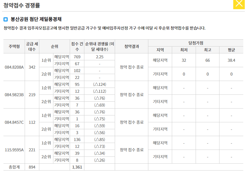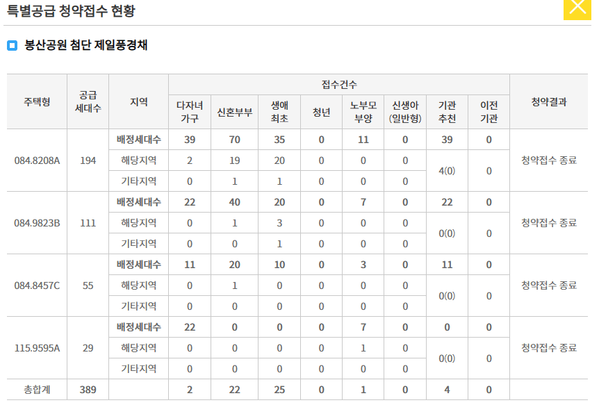 특별공급 청약에서는 그렇게 빛을 발하진 못했습니다. 총 389세대 모집에 54세대가 신청을 하였고 서류에 문제가 없으면 모두다 당첨이 된것으로 보이고 1순위 청약에서도 84㎡A타입에서만 2.25:1 의 경쟁율을 보였으며 나머지 타입에서는 미달되었습니다. 요즘 부동산 시장이 진짜 많이 얼어붙어있다는것을 전적으로 나타내주는 지표라 생각됩니다.
