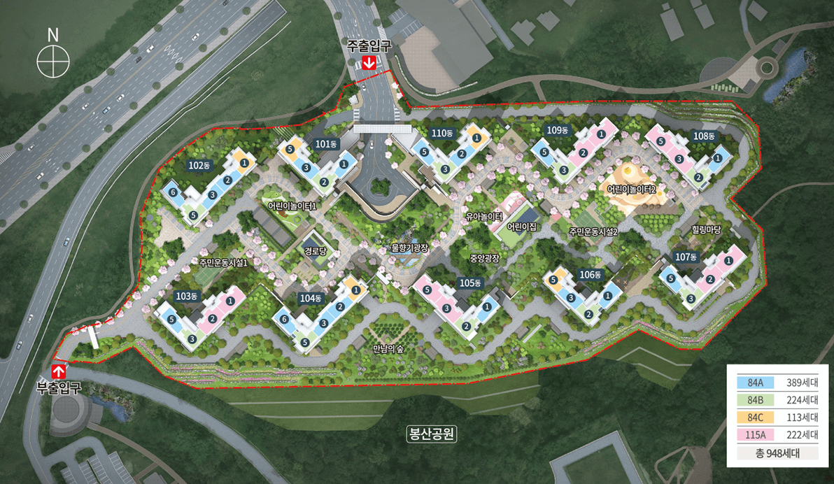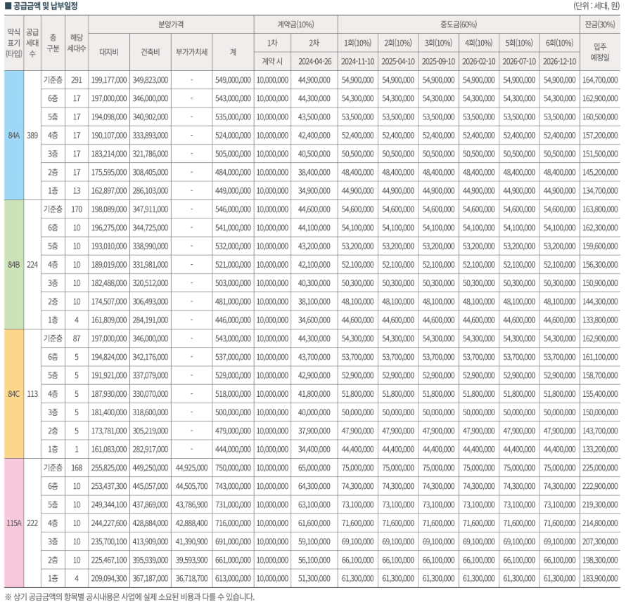 - 세대수: 84㎡A타입 389세대, 84㎡B타입 224세대, 84㎡C타입 113세대, 115㎡A타입 222세대, 총 948세대